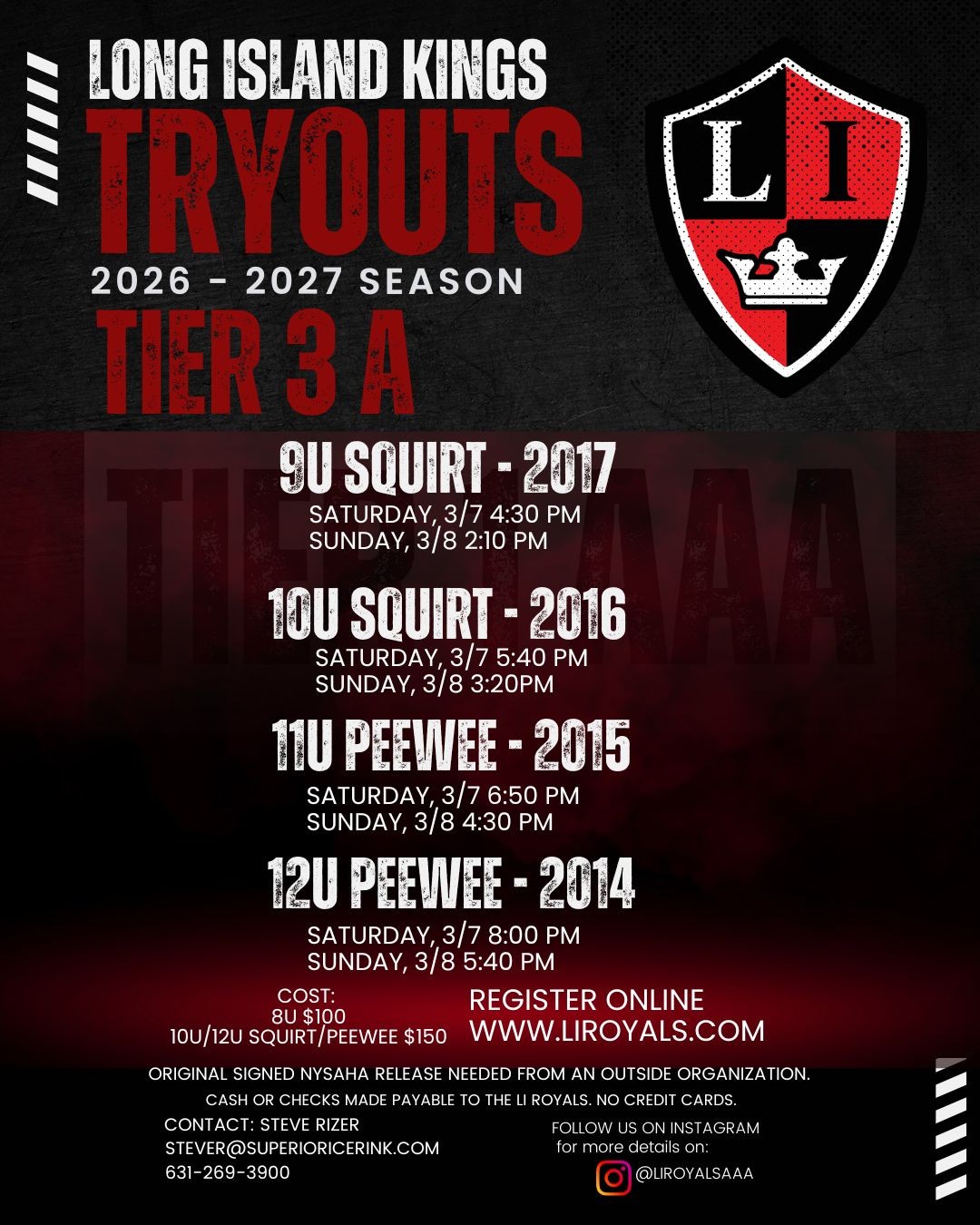 All tryouts will be held at our home ice, Superior Ice Rink, located in Kings Park, New York.